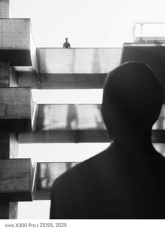 站在这些几何感的建筑里, 像走进了时间被按下静音键的现场。 远处雕塑和眼前的剪影, 在85mm的镜头里成了隔空的呼应, 风从混凝土的缝隙里穿过去, 连光影都带着点冷静的温柔。 vivo X300 Pro的黑白模式太懂这种氛围, 把所有情绪都揉进了明暗里, 原来沉默也能被拍得这么有故事感。