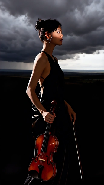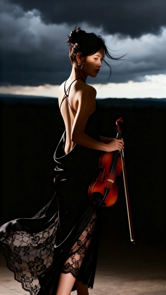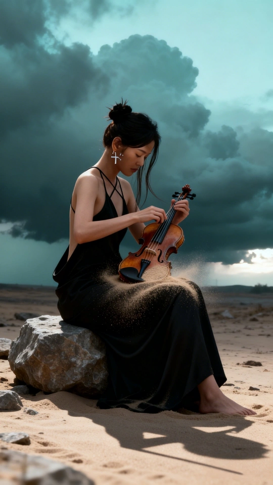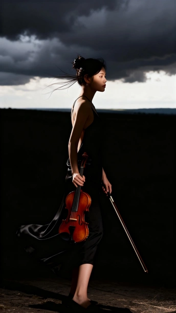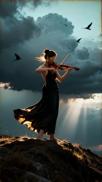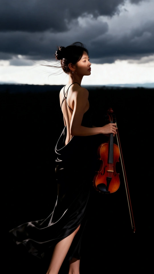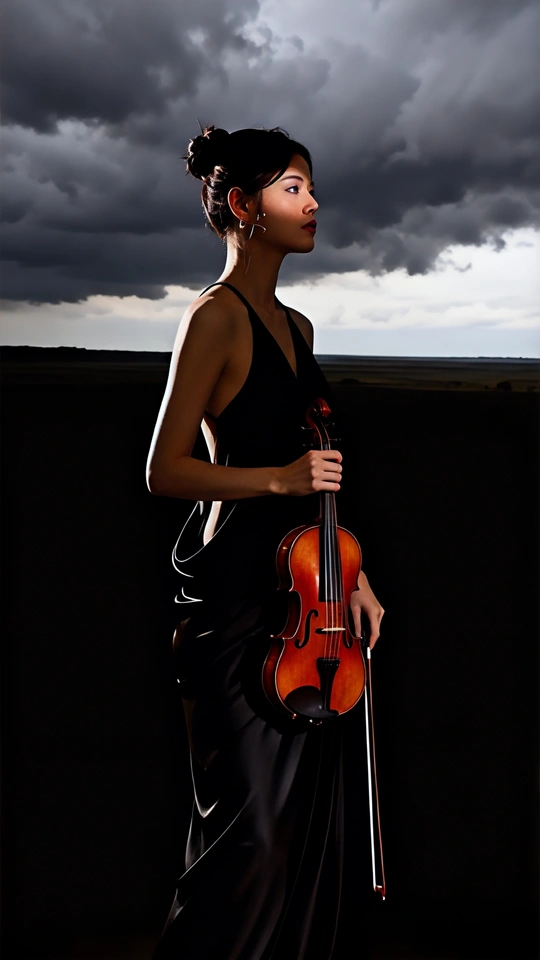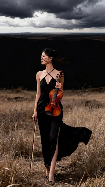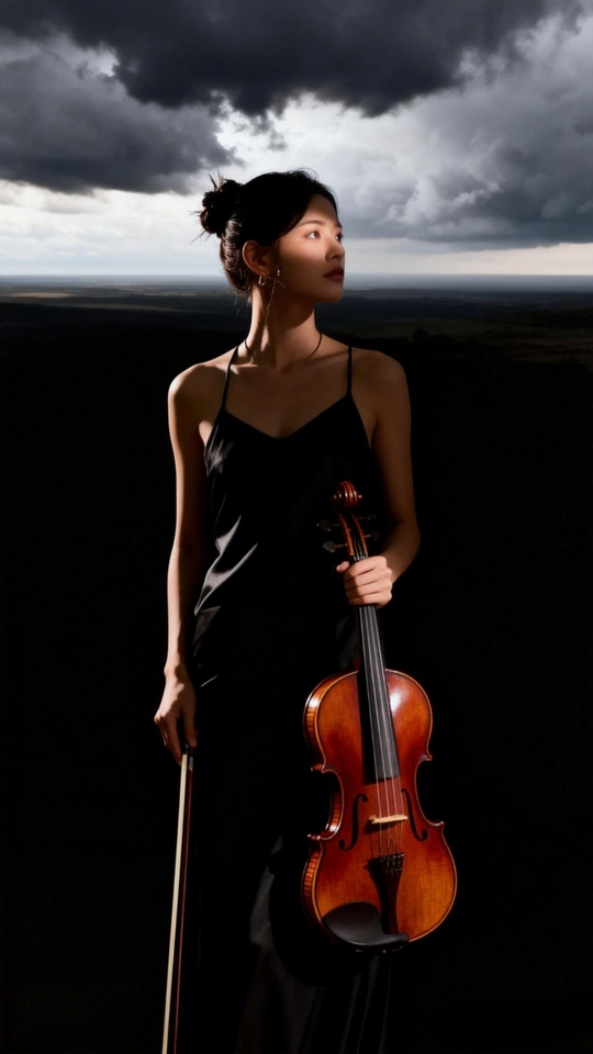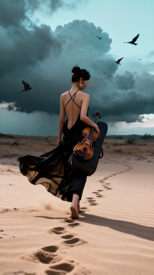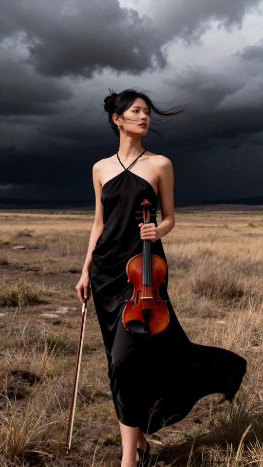 黑裙淌过天地 小提琴的弦 挑动风的褶皱 乌云低悬 飞鸟划破灰幕 自然与旋律对答 指尖起落 是心灵的回声 脚下泥土 托着梦想的沉 无人之境里 音乐开口 说孤独 也说自由
