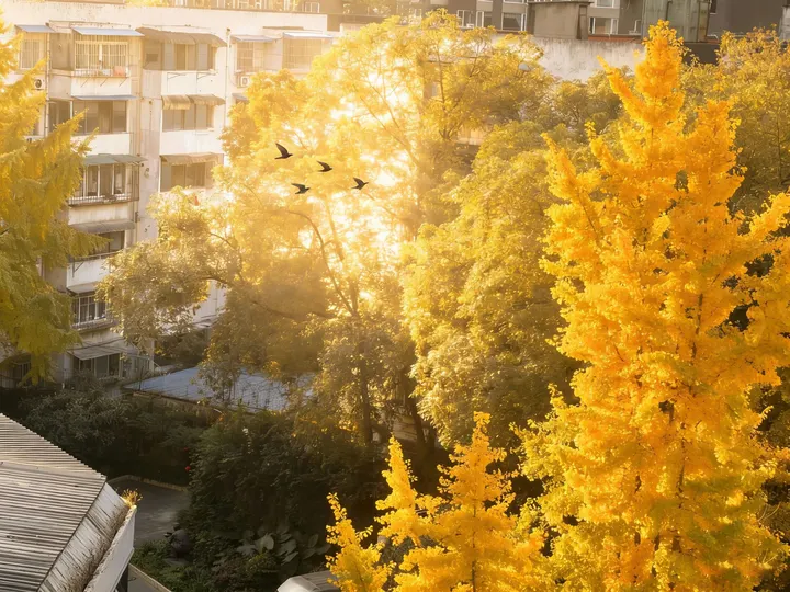 抬眼撞见的好天气里,楼群缝隙正漫出秋的信笺——几树金箔似的叶,把风都染成暖色调。 风过处,碎金摇摇晃晃,恰好有飞鸟斜斜掠过,把这帧透亮的秋,轻轻揉进日常里。
