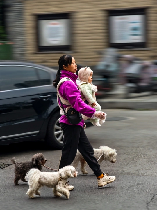 姐真的很忙!路边瞅见她,胸前贴个软乎乎的娃,手里捏着皱巴巴的纸,腿边仨毛球跟装了弹簧:白的叼裤脚拽,棕的扯绳窜,还有只绕着脚打旋儿。她脚不沾地挪步,一边躲车一边薅狗绳,连抬头喘口气的空都没有,活脱脱把“带娃+遛狗+赶路”揉成了团团转的陀螺,路过的都忍不住叹:这姐的忙,肉眼可见的满档!