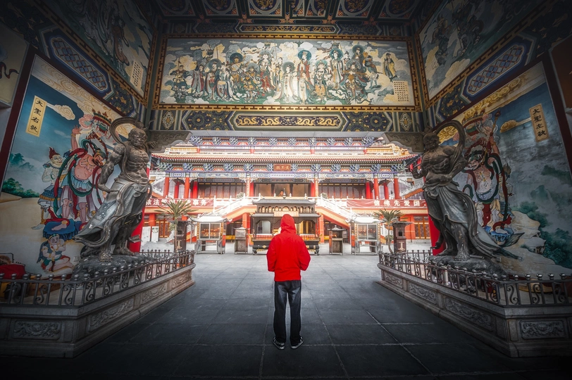 朱漆山门敞着旧岁的彩,红衫身影是闯进来的新色。金刚像守着壁画里的神佛,石阶上的步履轻叩着古刹的晨昏 —— 这一瞬,是烟火人间与梵音古殿的擦肩。