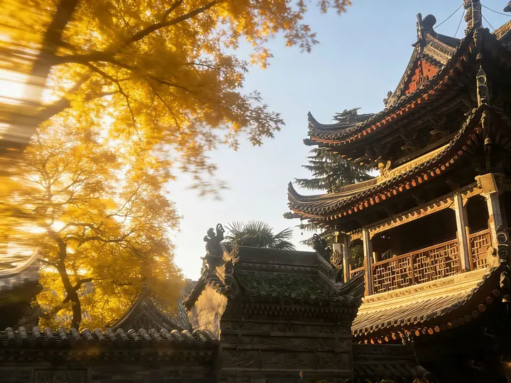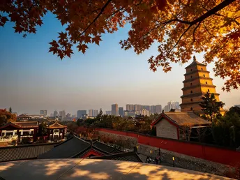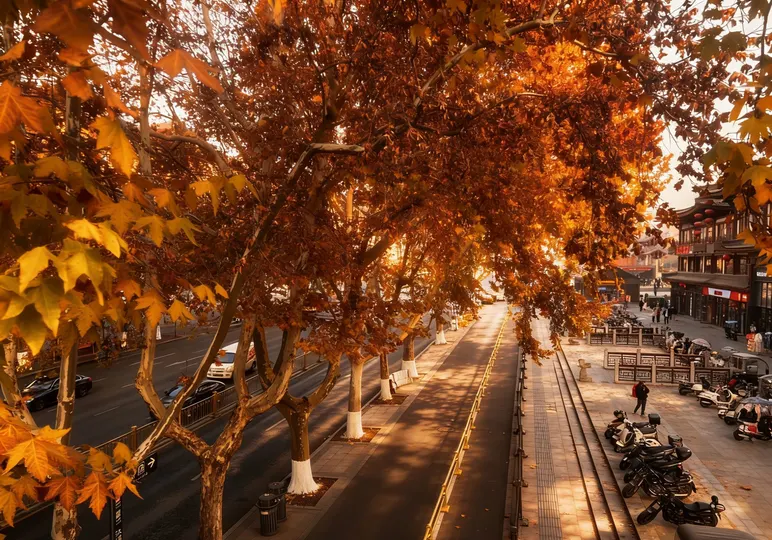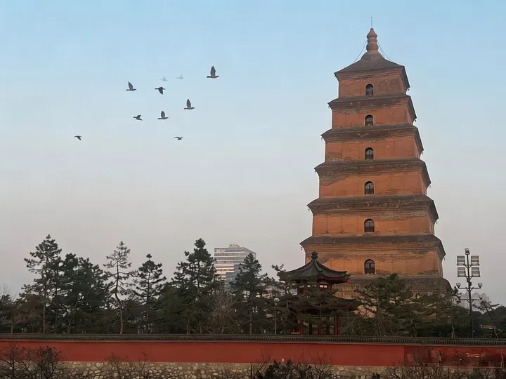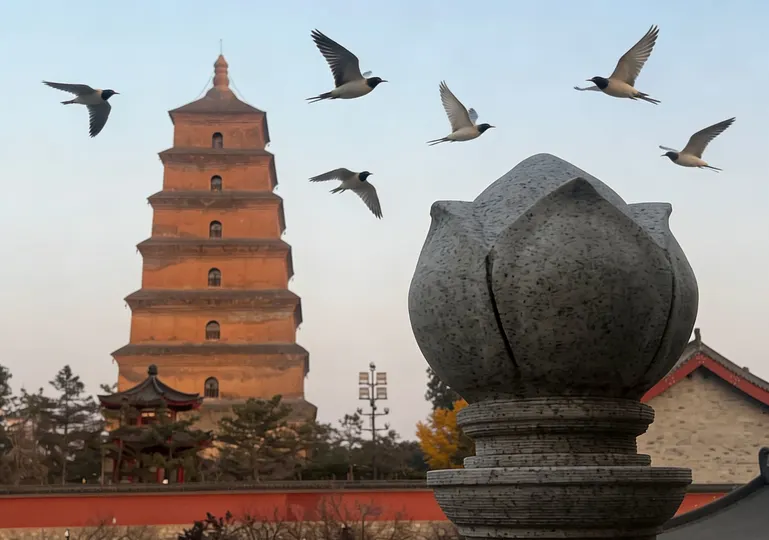 踏入西安的深秋,回民街的檐角坠着红灯笼,梧桐叶把街巷染成焦糖色,烟火气裹着秋意漫在青砖路上。 大雁塔立在暮色里,飞檐掠过流云,飞鸟绕着塔身轻旋,千年的塔影在秋风里静静舒展。落日吻过仿古建筑的屋脊,光影揉碎在枝叶间,长安的秋,一半是市井的暖,一半是岁月的悠。