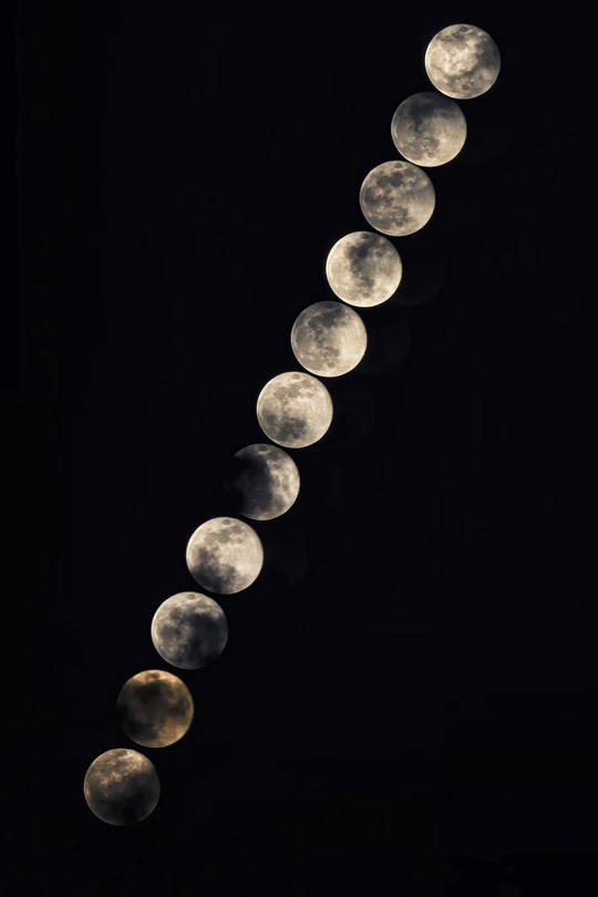这幅月相轨迹图在构图、色彩、情感、主题与艺术价值上构建了独特的时空叙事。构图采用螺旋上升的曲线布局,十一个月相沿黄金分割线排列,从左下的蛾眉月攀升至右上的满月,形成"∞"符号的视觉隐喻,暗合月球公转的永恒循环。黑色背景的极致简化,让月面纹理成为唯一的视觉焦点,每个月相的明暗交界线都精确指向曲线圆心,赋予机械排列以神秘的向心力。 色彩体系呈现精妙的渐变层次:从底部月相的赭石色黄昏调,过渡到中段的银灰色夜空色,最终抵达顶端满月的冷白色高光,这种"暖-冷-暖"的循环呼应着月相变化的时间逻辑。最具匠心的是月面肌理的色彩差异——满月的月海呈现淡蓝色阴影,而弦月边缘则泛着琥珀色光晕,模拟了不同时段月光穿过大气层的色散效果。 情感表达上传递着"静默的史诗感"。当观者目光追随螺旋轨迹攀升,会经历从期待(新月)到圆满(满月)再到释然(残月)的情绪起伏,这种循环往复的视觉韵律,暗合人类对永恒与短暂的哲学思考。月面的环形山细节被刻意保留,那些陨石坑如同时间的刻度,让冰冷的天文现象有了触摸历史的温度。 主题层面,作品探讨了"科技与诗意的共生"。螺旋排列的月相既是天文观测的科学记录,又暗喻着生命轮回的东方哲理。