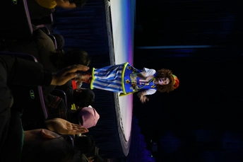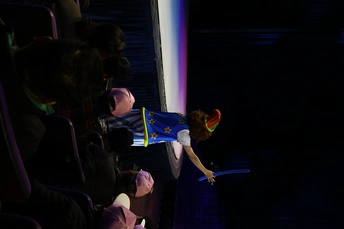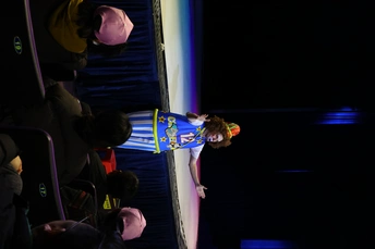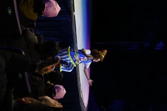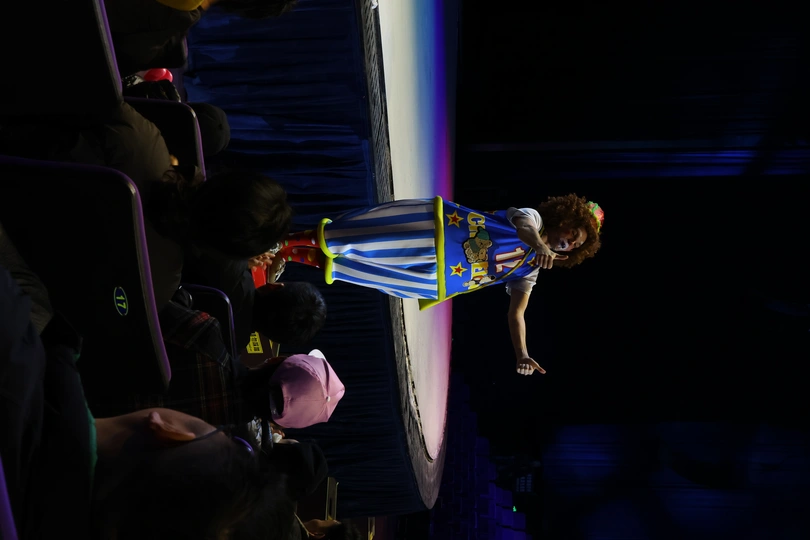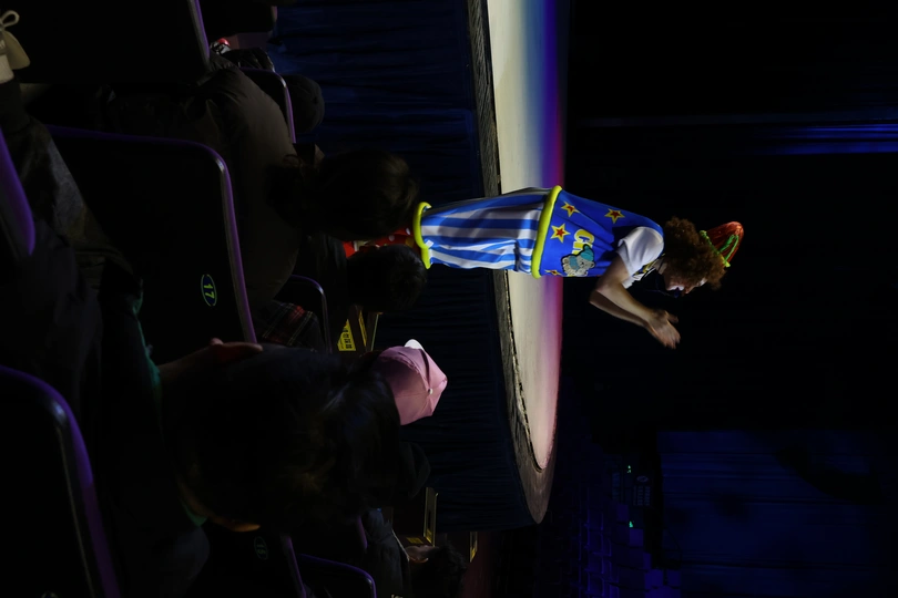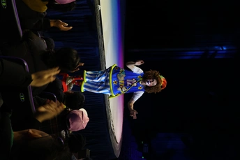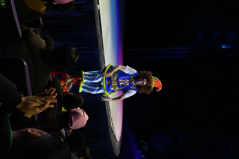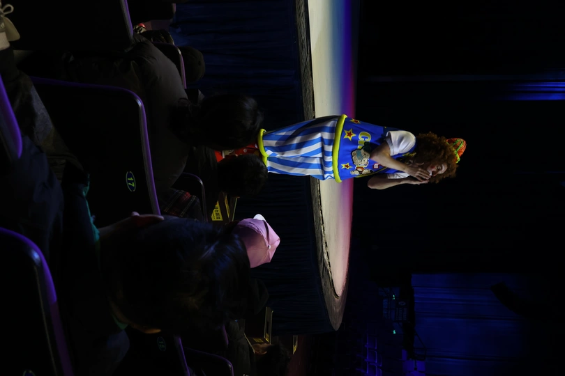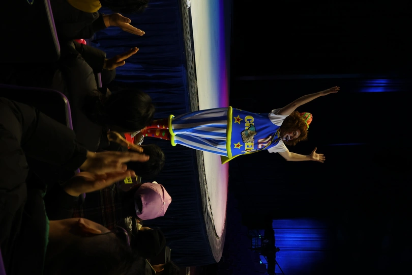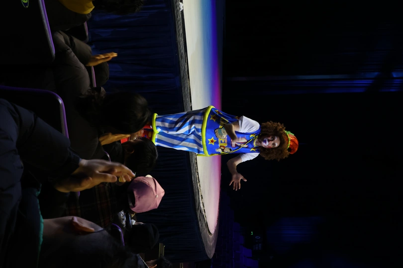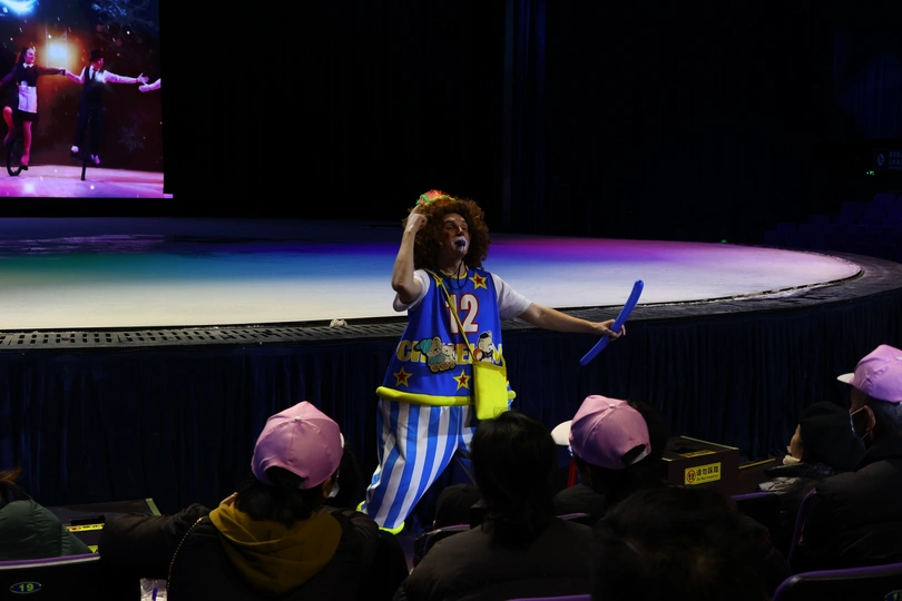 一场俄罗斯冰舞秀即将开演,现场一小丑即兴与观演者互动秀表情包,简单的肢体语言为即将登场的冰舞拉升了热情的氛围人气。
