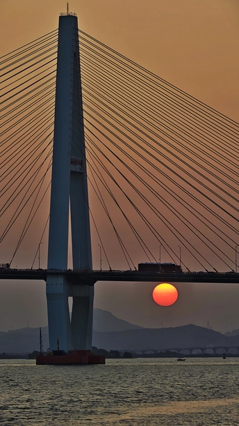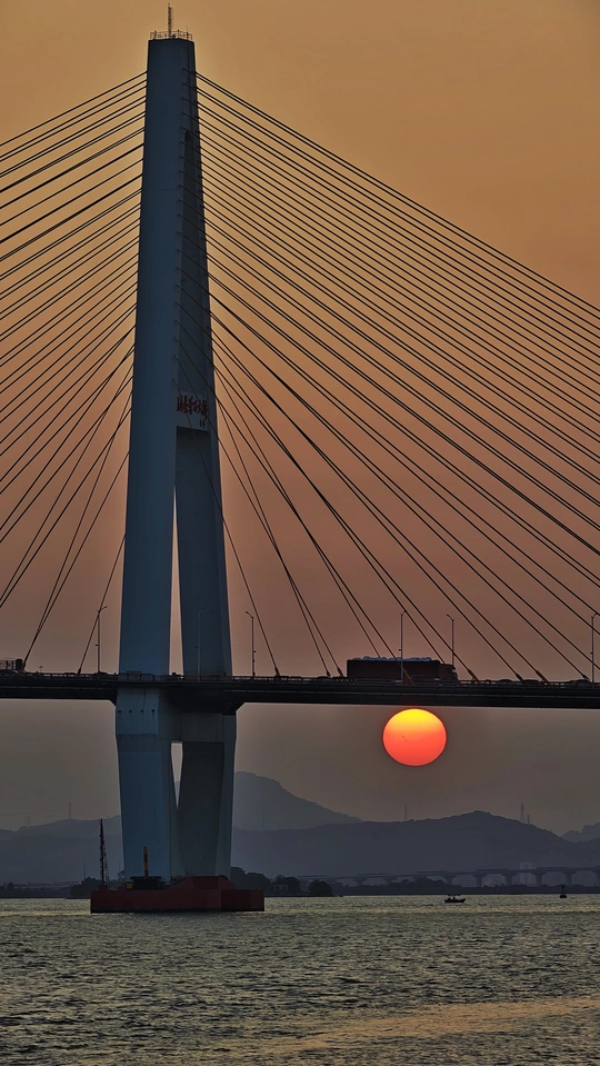 夕阳西斜礐石大桥,刚好与桥梁相切。礐石大桥是连接汕头内海湾南北两岸的重要通道,桥上车辆来往穿梭。