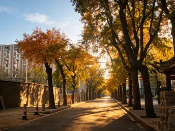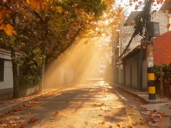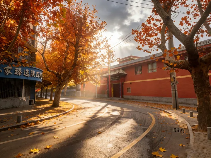 西安的秋,藏在巷陌与街衢的肌理里。 回民街的深巷被光影裁成温柔的模样,老墙斑驳处,秋阳漏下几缕金芒,似是时光悄悄掀开了盛唐的一角;生态大院旁的行道树,黄叶在风里打着旋儿,上帝光漫过枝桠,把寻常的路走成了诗意的画卷。 红墙黛瓦边的街道,秋雨洗过的路面映着梧桐的橙黄,落叶铺就的纹路里,藏着长安独有的慵懒;市井小巷的枝柯间,落叶簌簌坠下,上帝光穿透层叠的叶影,让烟火气的街,也沾了几分秋的浪漫。 这一城的秋巷,光揉着叶落,每一步,都是写给长安的诗。