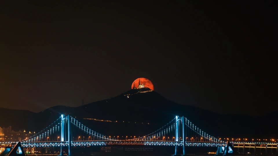 跨海大桥的蓝色灯光像星河落进海面,海螺塔的建筑在超级月亮的红光里像童话城堡,整个画面又浪漫又震撼,感觉城市的夜晚突然有了魔法~ 拿着相机蹲了好久才等到月亮和桥、山完美同框,按下快门的瞬间,觉得所有等待都值了!大连的夜真的藏着太多惊喜,这张图我能反复看一百遍! (悄悄说:听说超级月亮不是天天有,能拍到真的好幸运~)