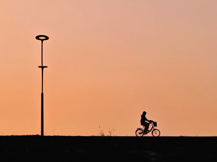 夕阳把天空泼成暖橙色,骑行的人、单车和路灯都成了黑影子,在天地交界线,慢慢踩出悠闲的光阴。