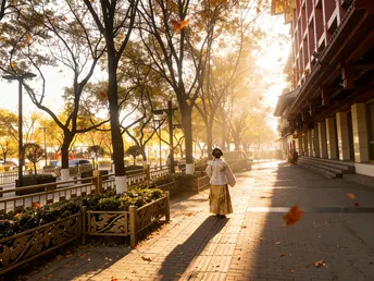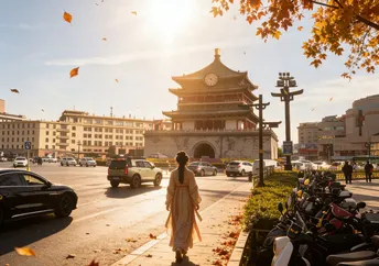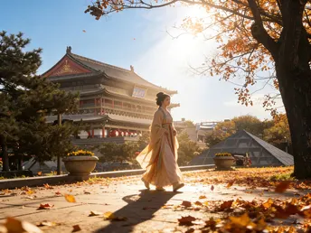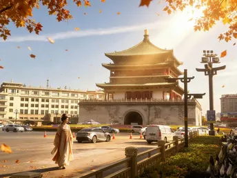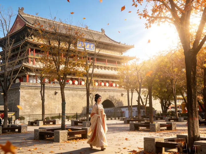 当秋日的上帝之光穿透云层,为西安钟鼓楼镀上一层暖金,檐角的飞翘便成了时光的刻度。落叶如蝶,轻轻掠过青砖黛瓦,在鼓楼的鼓面旁打转,又顺着钟楼的铜铃余音飘落。古装女子的裙裾拂过积着薄叶的石阶,步履轻缓间,似与六百年的晨钟暮鼓撞个满怀——那是历史的厚重与秋光的温柔,在此刻静静相拥。