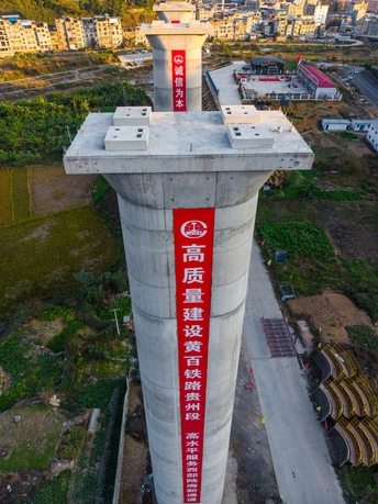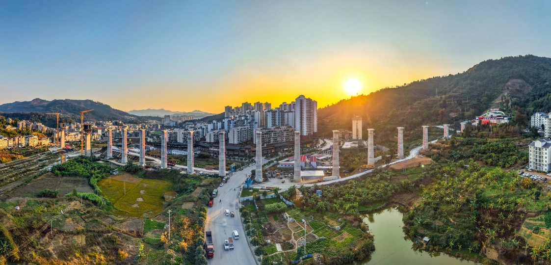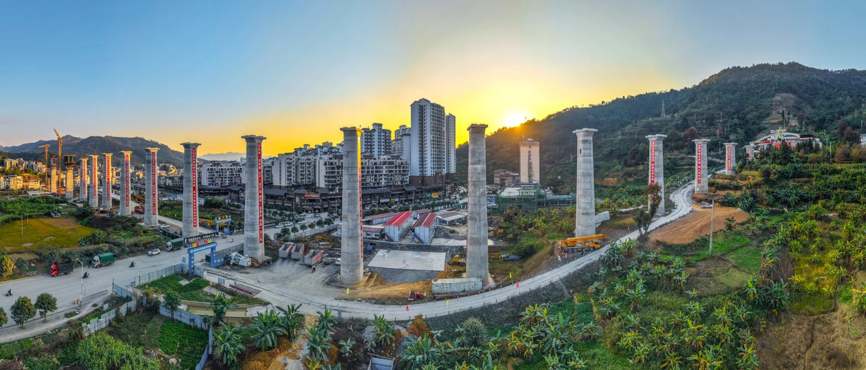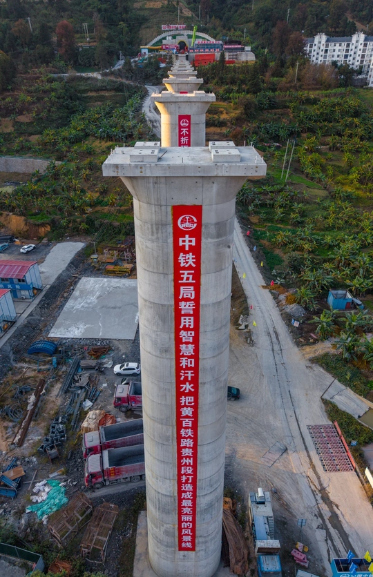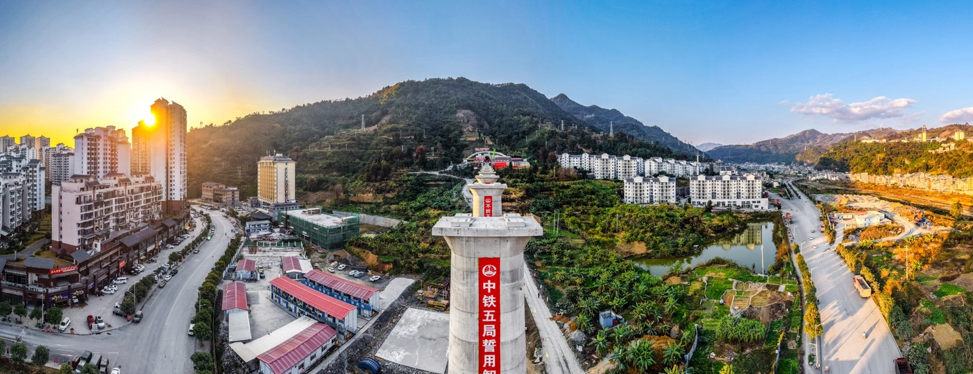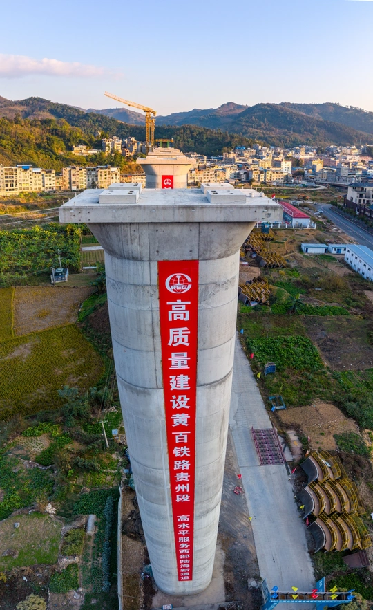 2025年12月7日,贵州省黔西南布依族苗族自治州望谟县县城,在新建黄桶至百色铁路贵州段工程望谟河特大桥(望谟河特大桥全长1287.018米,先后跨越市政道路、望谟河、209省道,穿越居民区)建设工地,巨大的跨河铁路大桥桥墩屹立,桥下和周边城市的高楼林立,车来车往,成为小城靓丽的一道风景线。 由中铁大桥局集团有限公司承建的黄百铁路(贵州望谟段)项目建设持续发力,抓进度、保节点,全力以赴推进项目建设。黄百铁路望谟县标段线路总长32.029km,为国铁I级单线铁路,设计时速160km/h。主要施工内容包括隧道7座,占比86.1%,正线桥梁8座,占比7.5%,车站3座,其中会让站2座,中间站1座。 望谟,这座王母河穿城而过,南盘江、北盘江和红水河环绕拥抱的城市,抢抓历史机遇打赢打好综合交通大会战,做好“铁(铁路)高(高速公路)水(蔗香港航运)”三篇文章,在已建成的紫望高速(北)、罗望高速(东)、望安高速(西)的基础上,正在建设的红水河跨江大桥将贯通望谟至广西自治区百色市高速公路(南),以及正在建设中的黄百铁路,力争将望谟打造为东西南北综合交通枢纽,努力为交通强省贡献望谟力量。