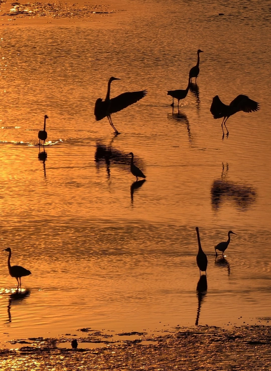 冬日夕阳暖照河滩,一群候鸟姿态各异。有的展翅欲飞,有的悠然觅食,它们的身影在金色水波中,勾勒出灵动的自然乐章。