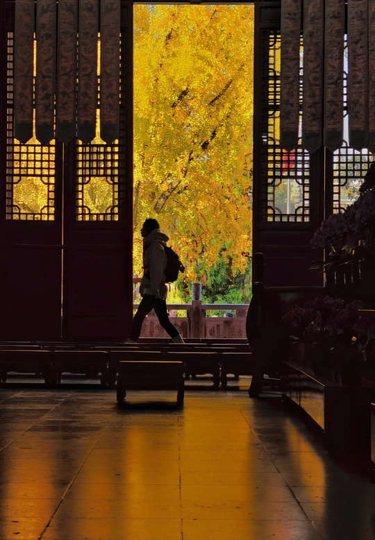 栖霞寺大殿外的银杏黄了,阳光直射,遍地金黄