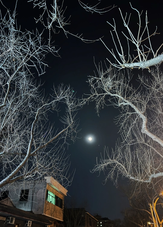可能是城市里地面光线比较强吧,即使是冬天的22点半,天空也不是很黑的那种。蓝色的夜空还挺好看的。最后一张是对着月亮拍的,天空没有那种蓝。