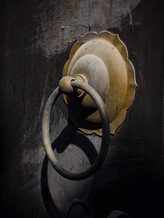 锈迹斑斑的铜环,嵌在饱经沧桑的木门上,如同一枚凝固的时光印章,镌刻着过往的晨昏,也在无声诉说着门内门外的岁月变迁。