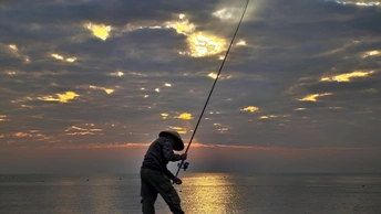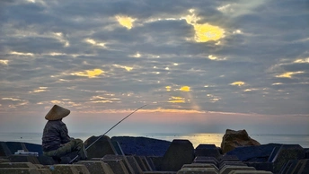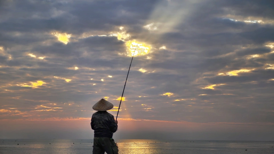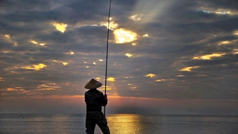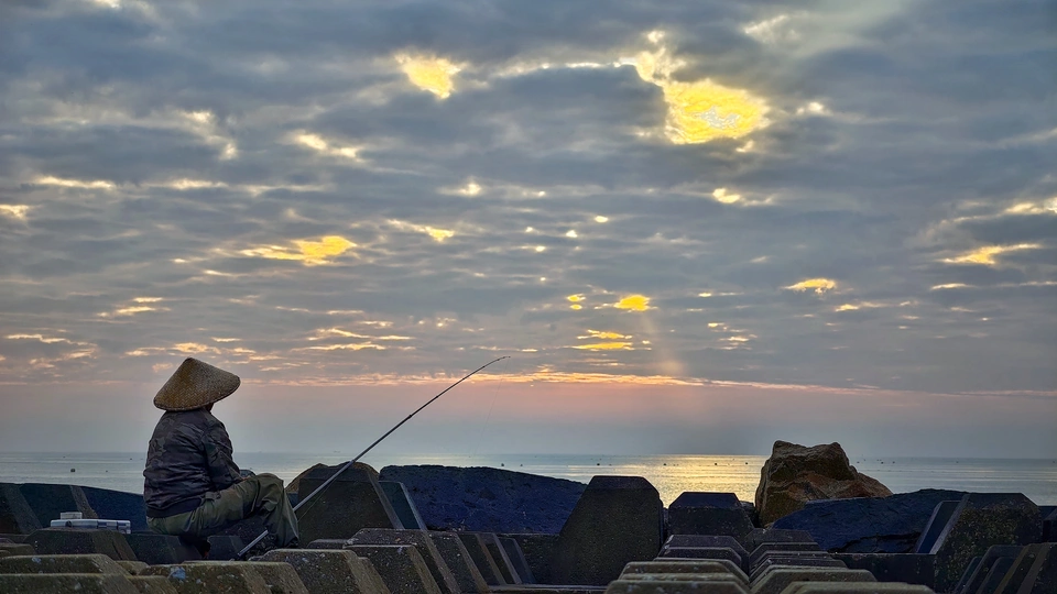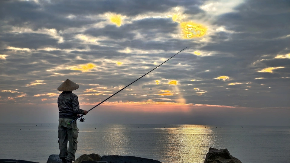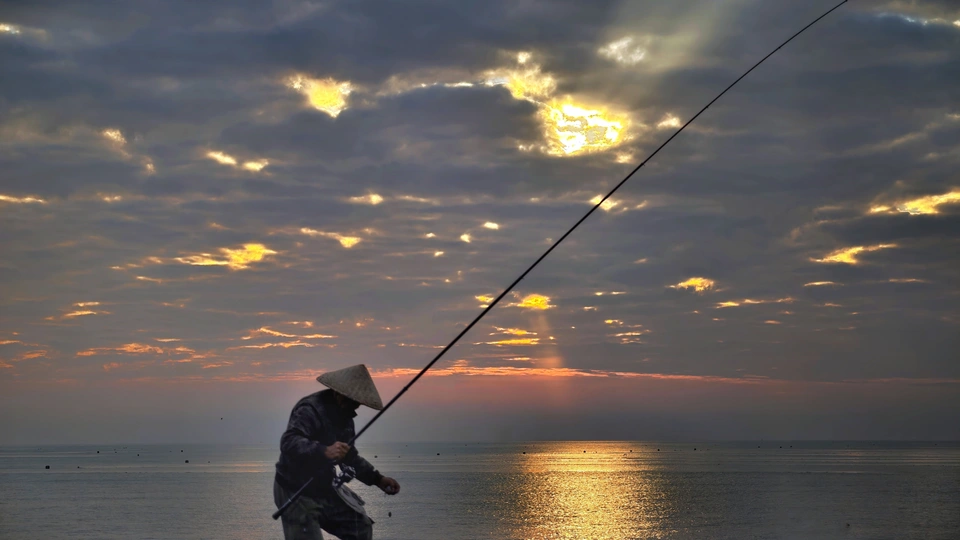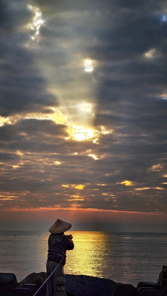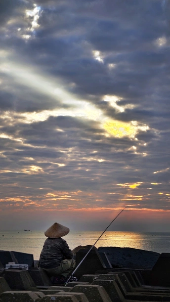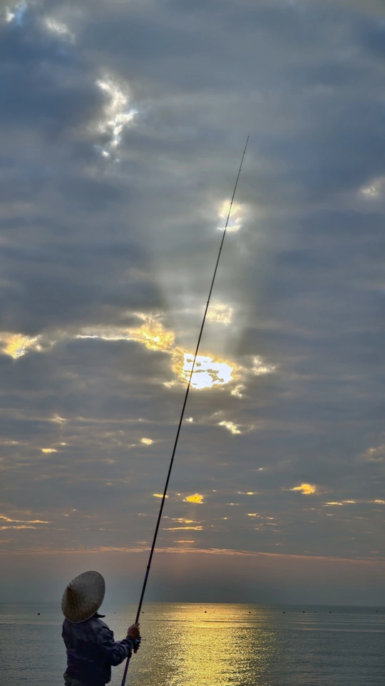 日出丁达尔效应,钓鱼者正在海边钓鱼。