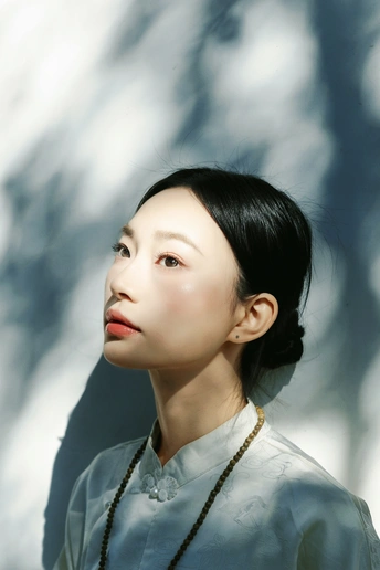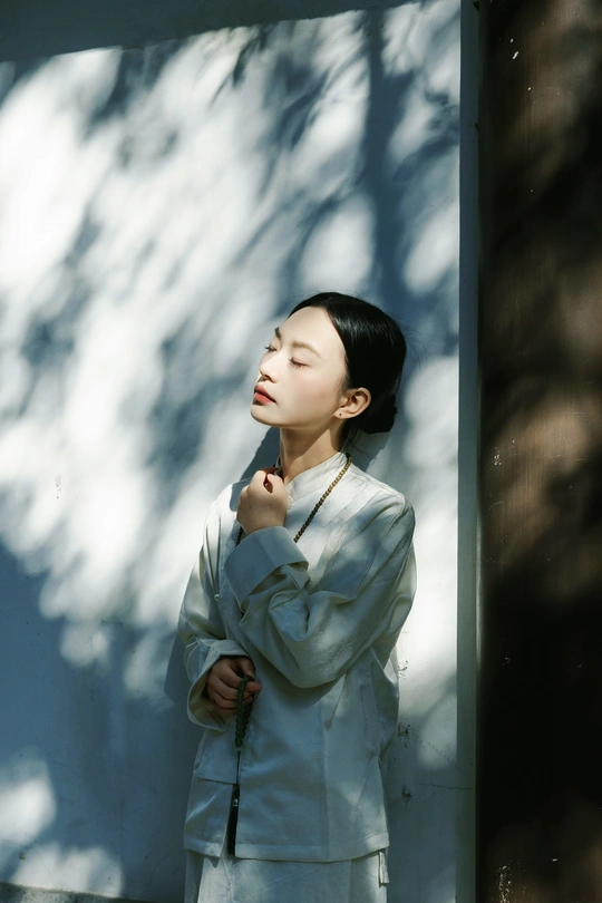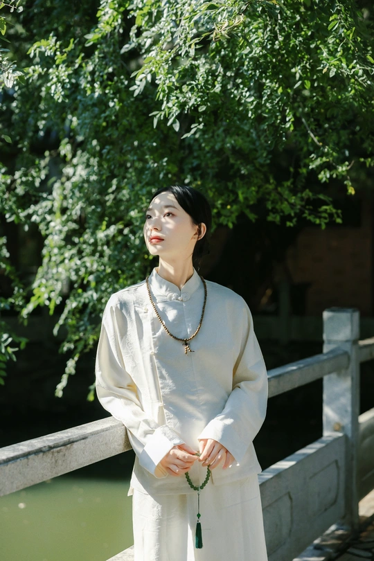 《素伊问禅》 出镜:伊伊 地点:醉观公园 白裳女子执绿玉珠串,踱过石桥曲栏。 红灯笼在竹影间题写,光斑与佛珠一同垂落, 将长卷染成会呼吸的水墨。