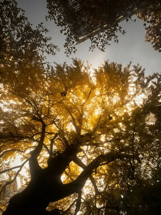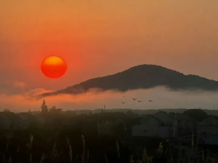 下火车时抬眼,撞见老树的枝桠间淌下漫天金芒,金黄的叶簇在光影里晃成一团温柔的火焰,像是大地捧着一腔暖意,迎接着风尘仆仆的归人;而方才在火车车窗边,看落日把天际揉成橘红的绒锦,浑圆的红日挨着远山的轮廓沉落,云雾绕着山尖,飞鸟掠过霞光,那抹晃在玻璃上的夕阳,是旅途里最温柔的序章。