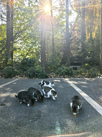 在停车场里遇到一群流浪猫,拿出随身携带的猫粮给它们开饭。