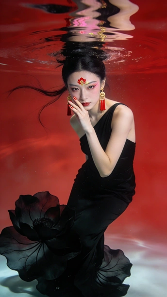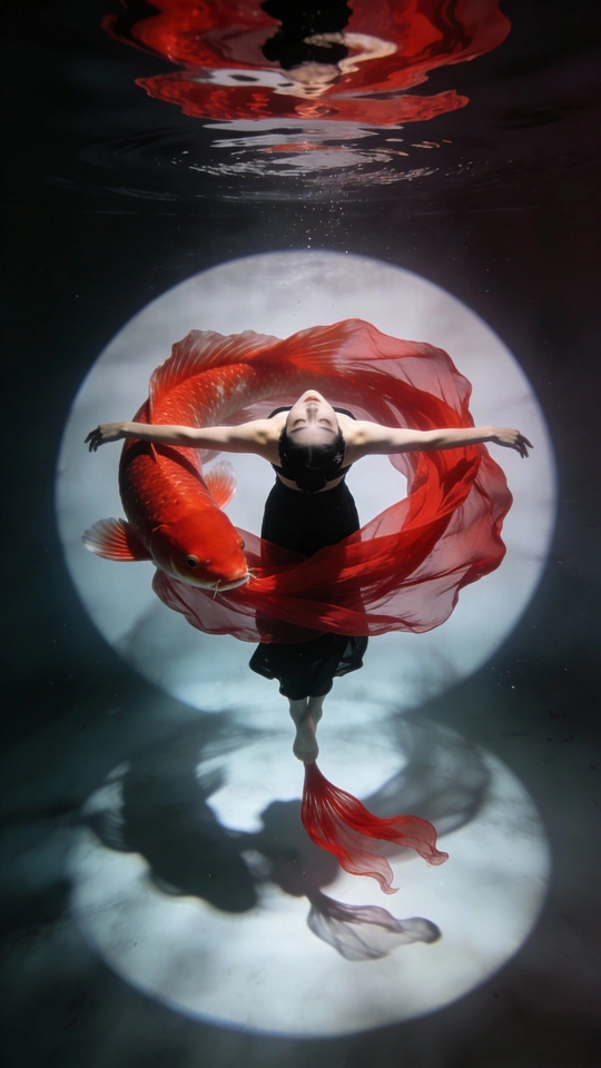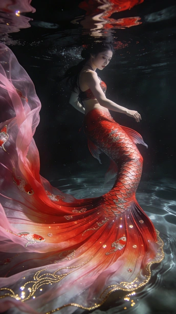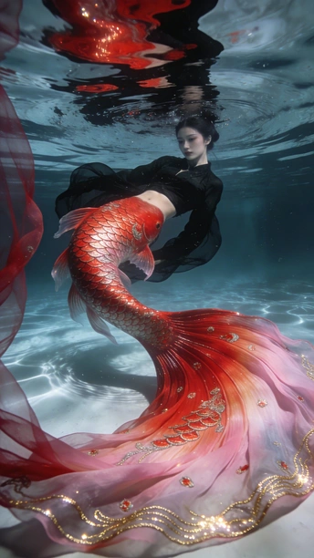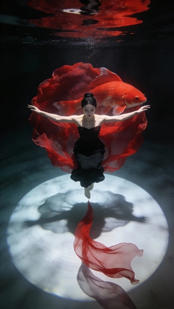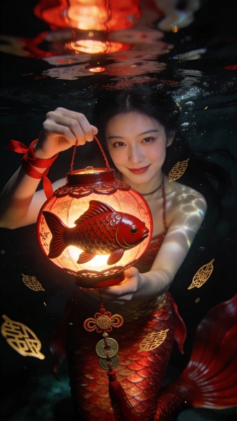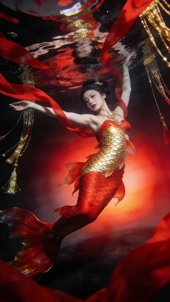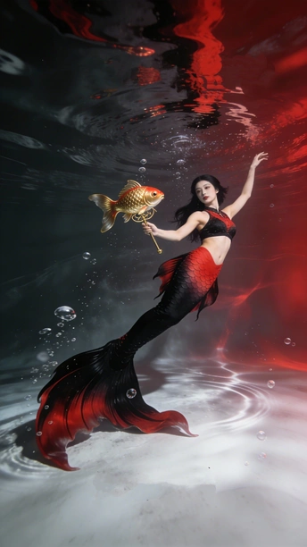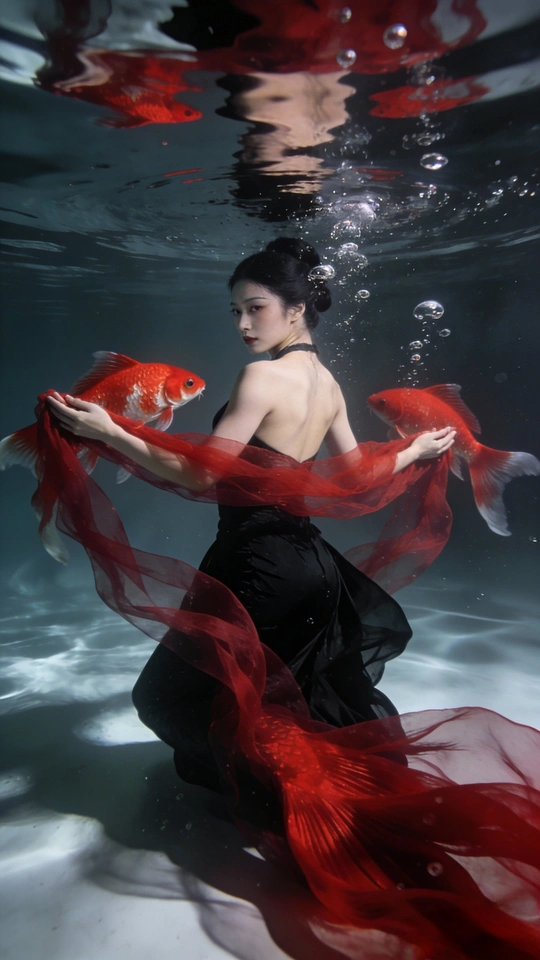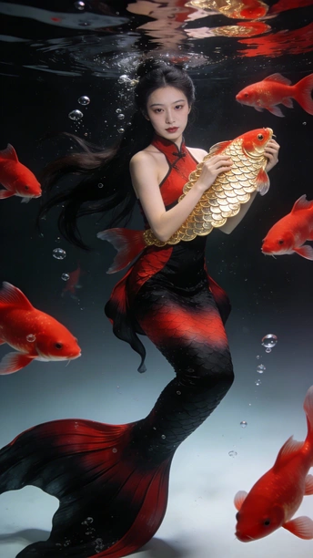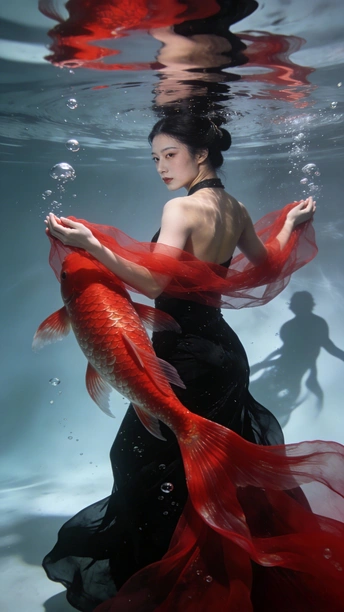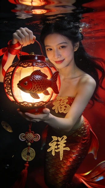 蓝是深海未眠的夜 你裹着黑裙 牵两尾火焰 薄纱尾鳍漫过指节 水流把轮廓译成星的语言 鳞片是凝固的心跳 每片都驮着半盏灯的暖 红唇碰碎波纹时 福字从光影里浮上来 软成一捧会呼吸的红 你不必真的游 裙摆早替你长出潮汐 那些没说出口的向往 都藏在尾鳍轻摆的弧度里 ——海底没有童话 你就是童话本身