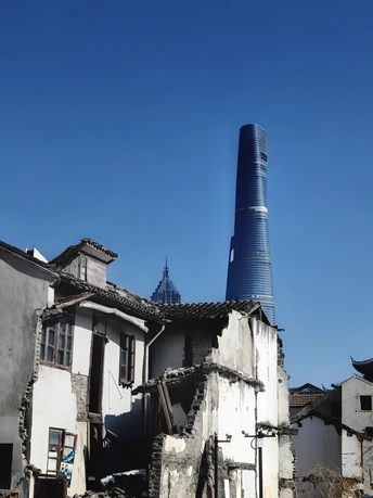 拆迁的旧小楼和远处现代建筑对比