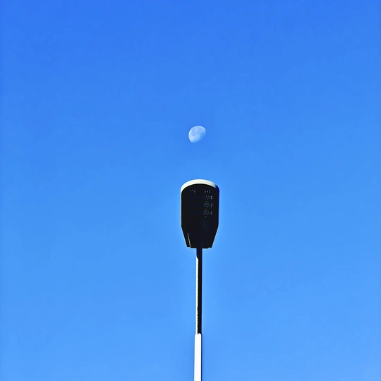 早晨接孩子抬头瞧见晨月还未隐去于是转来转去找陪体最后选了个路灯把月留在上方打卡了张今日标签。