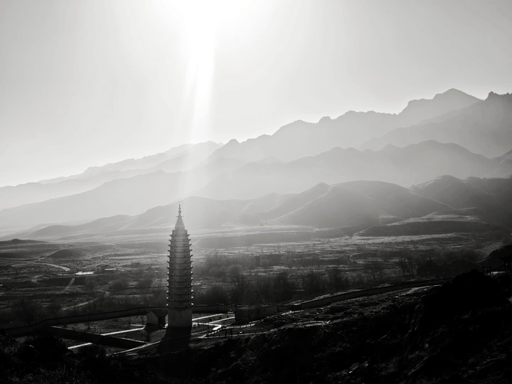贺兰山的风裹着西夏旧岁, 双塔在残阳里站成水墨留白。 山岚漫过千叠峰峦, 把岁月晕成半阙无声的诗。 ——拜寺口的寂静,是历史最轻的呼吸。