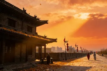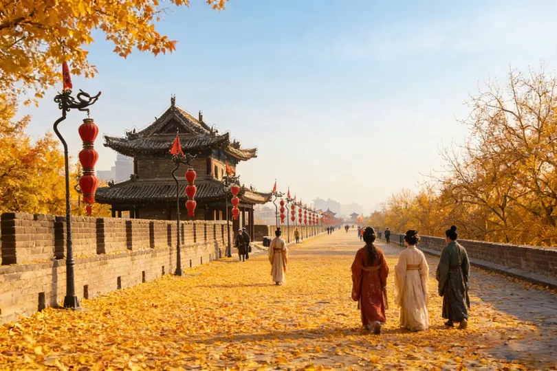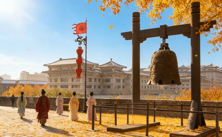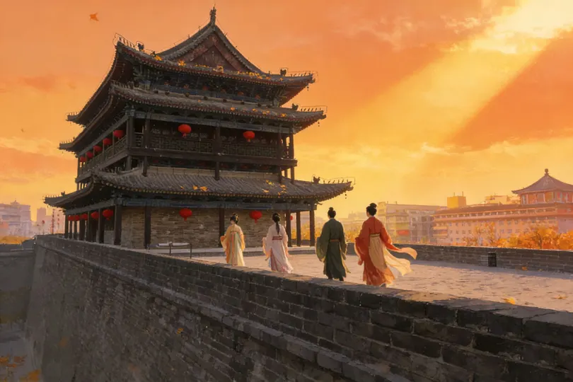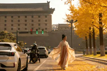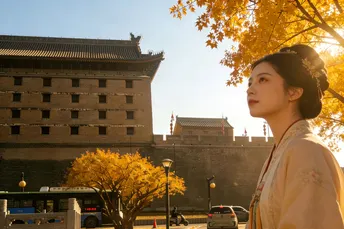 金黄银杏垂落的长安街头,古城墙在秋阳里漾着温润的砖纹,飞檐翘角藏在金叶间,晕开千年的古韵。古装佳人缓步踏上城墙,衣袂被秋风轻轻掀起,她抬眼望向满城秋黄,指尖轻触斑驳的砖石,这一刻,秋光为她停驻,古城的诗意也随她的脚步,漫过了时光的纹路。