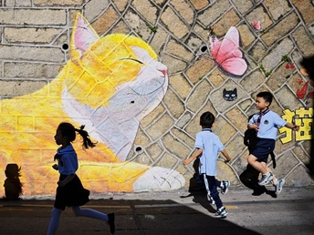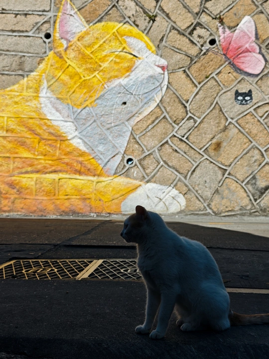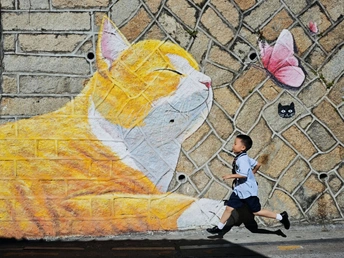 孩童街巷奔跑,墙面萌猫涂鸦跃动,光影交织成温馨童趣画卷。