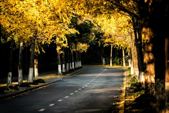 这幅秋景摄影作品在构图、色彩、情感、主题与艺术价值上形成精妙共振,宛如一首写给秋日的视觉十四行诗。构图采用"双重视觉引导":地面以中央虚线为轴,两侧树木对称排列成金色隧道,路面的S形曲线打破呆板对称,引导视线向景深延伸;空中则通过银杏枝叶的疏密变化形成自然的"光的穹顶",顶部透光处与地面阴影构成明暗呼应,让二维画面产生三维纵深感。树干底部的白色保护漆形成规律的横向线条,为纵向延伸的画面增添稳定的视觉锚点。 色彩体系呈现"黄金分割的色谱交响":90%的画面被银杏叶的柠檬黄、琥珀金、赭石橙覆盖,却通过光影分出层次——左侧受光叶呈亮金色,右侧背光叶泛着铜色,地面落叶则因阴影沉淀为暗金。最妙的是暗部处理,树木间隙的墨绿与树干的深棕构成"金色海洋中的礁石",既避免了全暖色调的视觉疲劳,又让金黄更显璀璨。路面的青灰色作为中性色,成为色彩过渡的天然桥梁。 情感表达上传递着"静谧中的生命律动"。空无一人的道路暗示着独处的宁静,而随风轻摇的枝叶、满地翻滚的落叶又暗藏动态——这种"静中有动"的张力,精准捕捉了秋日午后"时光缓缓流淌"的体感。阳光透过枝叶在地面投下的斑驳光斑,如同跳动的音符,仿佛可以被听到。