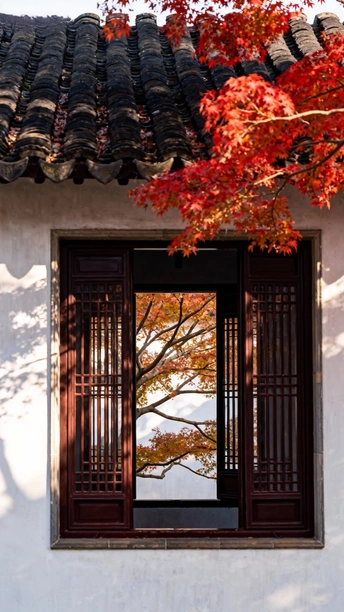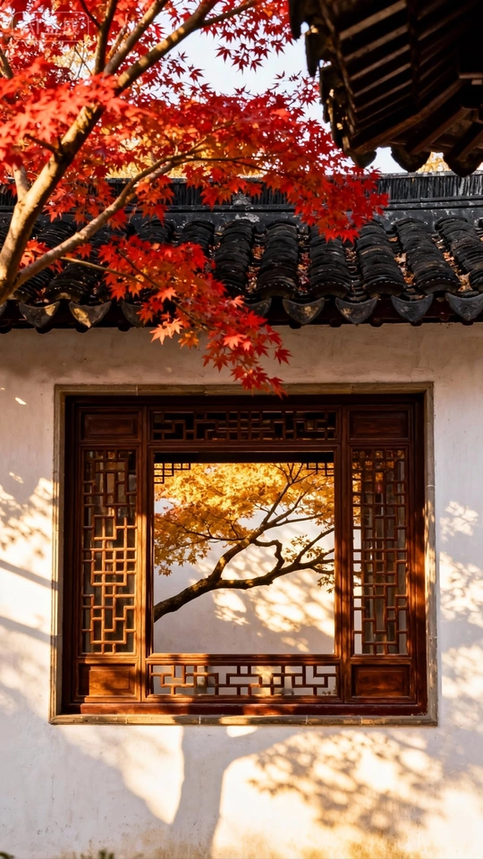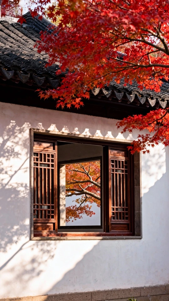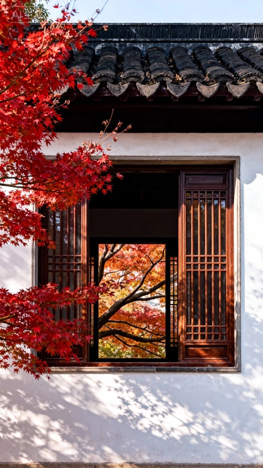 色彩:红色的枫叶与古建筑的深色调形成了鲜明对比,色彩搭配和谐,烘托出浓厚的秋意。但红色略显饱和,可以适当降低一些,让画面更柔和。 光影:光线柔和,使得画面整体明暗过渡自然。前景枫叶的光影层次丰富,增强了画面的立体感。 构图:采用框架式构图,将观者的视线引导至窗内的景物,主体突出。但前景的枫叶略微遮挡了视线,可以尝试调整拍摄角度,让窗内景色更完 整地呈现, 后期处理:后期处理整体自然,没有明显的过度修饰。可以适当提高暗部的亮度,增加画面的通透感。 主题原创性:将室外景色与室内静物结合,营造出一种宁静致远的意境,具有一定的创意。 情感共鸣:照片传达了秋日的宁静与美好,能够引起观者的情感共鸣。 思想深度:照片通过景物之间的对比,引发了对时间流逝和自然变化的思考。 总的来说,这张照片构图巧妙,色彩和谐,光影运用得当,具有一定的艺术性和感染力。