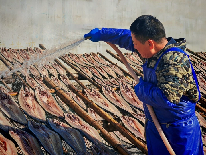 男子手持水管为竹架上晾晒的鱼干喷水。阳光下,成排的鱼干整齐铺展在竹制晾晒架上,充满质朴的乡土气息与劳作的生活质感。