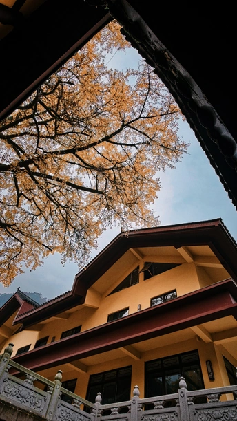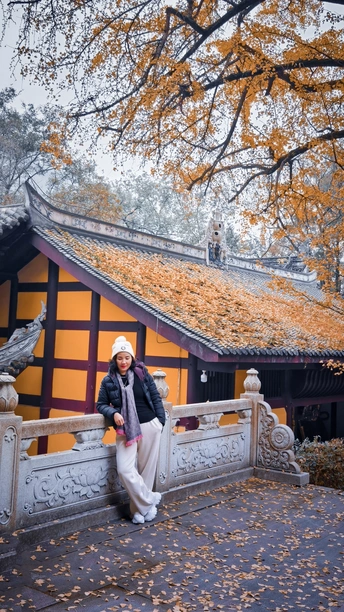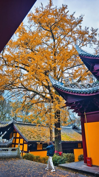 重庆初冬的暖意,藏在满城银杏的金黄里;而北碚温泉寺的韵致,恰是这抹黄与千年古刹的刚好适配。 500年银杏枝桠遒劲,将阳光筛成金箔,簌簌落在古寺的黃墙青瓦上——本是肃穆庄严的禅意之地,因这漫天金黄添了几分柔和,香火袅袅间,叶片与殿宇相映,光影与禅意相融,每一处画面,都是银杏与古刹最妥帖的契合。 站在树下看叶落成毯,才懂“适配”的意思:不是刻意的点缀,是时光里长出的默契,让千年古刹的静,与五百年银杏的暖,成了初冬最动人的风景。