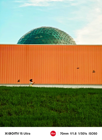 橙墙绿草间,奔跑少女与低空飞鸟形成空间竞速,柔和天光定格这场静中有动的趣味赛跑。