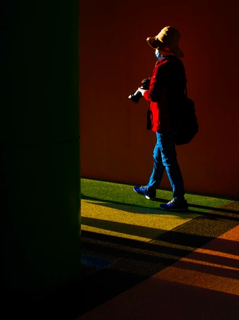 夕阳熔金,橙墙为幕。摄影师身着红衣蓝裤,背黑色背包,手持相机逆光而行。剪影轮廓被黄芒勾勒,地面光影交织如画。此刻,他不是观画者,而是画中人——光影为笔,天地为卷,每一步都踏在夕阳的诗行里,将时光定格成永恒的艺术瞬间。