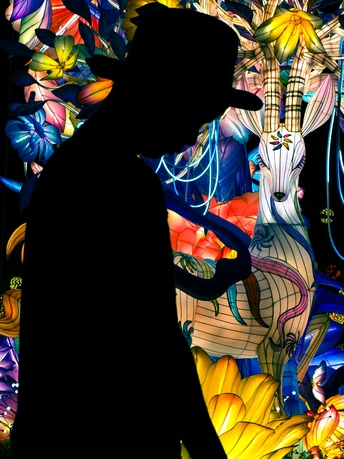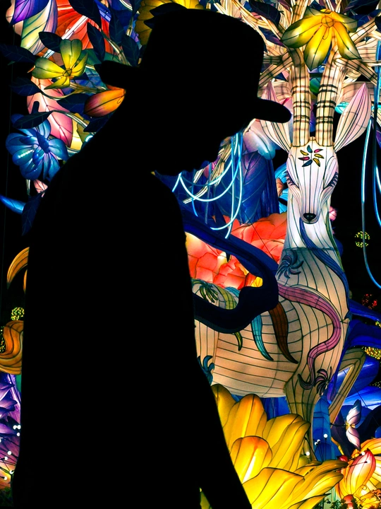 夜幕低垂,旅人披着月色独行,忽见远处鹿形灯盏如星河坠落。鹿角缀满金叶,面部彩纹流转,与身后繁花交织成幻境。旅人驻足,帽檐下的剪影与灯鹿对视,仿佛穿越时空的使者,在斑斓花海中遇见一场关于遇见的童话。镜头定格,是旅人寻鹿,亦是鹿灯寻旅。