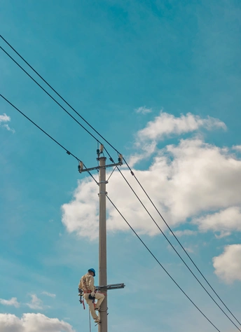 晴空下,工人如蜘蛛侠般攀附于塔杆。他双腿交叠稳立塔杆,一手紧握塔材,另一手操作工具。安全绳系于腰间。蓝色安全帽在纯净蓝天与蓬松白云间闪耀,既显专业严谨,又添孤勇之美,定格高空作业的惊险与匠心。