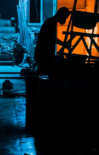 晚间装修现场,暖黄工灯凿穿暗夜,在工人轮廓镀上金边,阴影如墨汁般洇开。冷暖光域在此刻割裂时空,既凝固了专注的瞬间,又流淌出昼夜交替的静谧张力,恰似匠人用光影在墙上刻下的时光诗行。