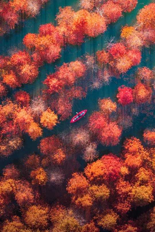 秋日的宁国落羽杉湿地呈现出丰富的色彩,有的水杉金黄,有的殷红,层次分明。一艘皮筏艇游弋至水杉中央,我用无人机记录下了这一画面 安徽宁国落羽杉湿地公园是皖南川藏线核心景点,以2000余亩水上红杉林闻名,可泛舟或徒步观赏,随季节由翠绿渐变为金黄、深红,被誉为“皖南喀纳斯” Shot on Dji air3s
