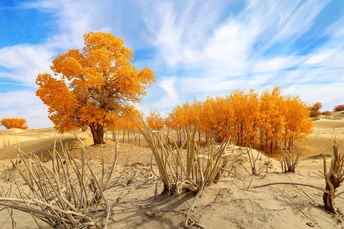 秋日,风高气爽,塔克拉玛干沙漠里的胡杨一片金黄!