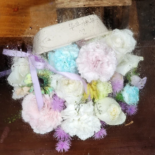 缤纷花束映着玻璃上的水珠,似欣喜的泪。"毕业快乐"的字样隐现,一场绽放与告别,在芬芳中悄然写下未来的序章。