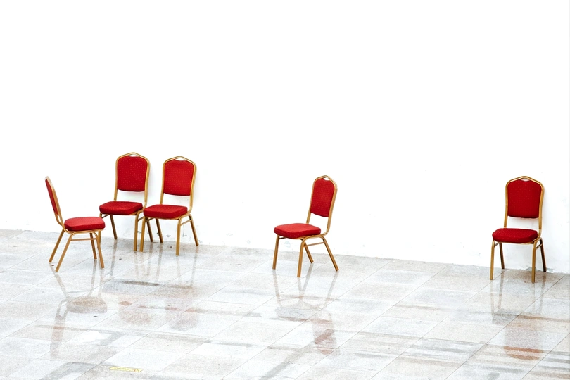 五把红椅沿白墙列阵,四把紧偎成团,唯最右那把独自偏离。金色椅腿在冷光地砖上投下疏影,在无垠空旷中恪守一份刺目的孤寂。