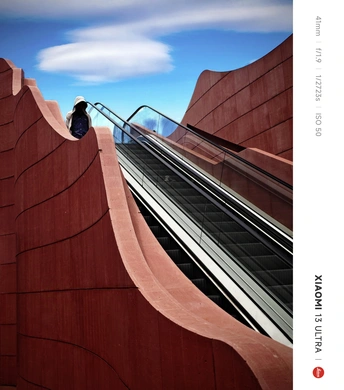 一袭灰衣沿朱红旋梯向苍穹步去,流云在蓝幕上定格。天地间唯剩色彩的对话,与一个向上的、孤独的剪影。