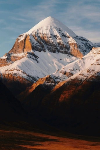 冈仁波齐巍峨静立,雪冠在晨光下洒着神圣的银辉。山体如巨碑般肃穆,四面云雾缭绕,仿佛天地在此折叠。风自山巅吹落,带着冰冷而清澈的气息,让人心生敬畏,仿佛靠近了世界的起点与灵魂的源头。