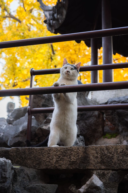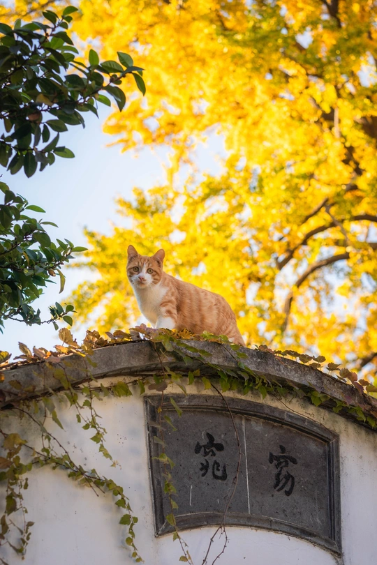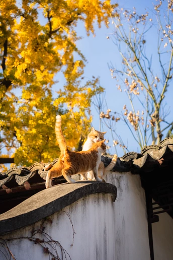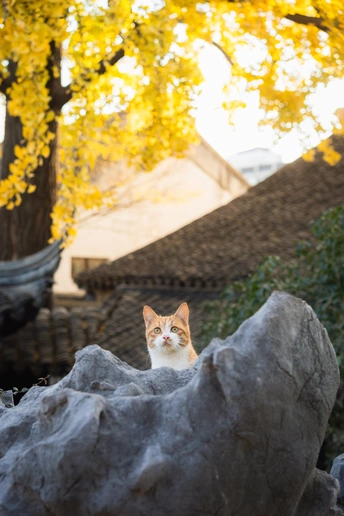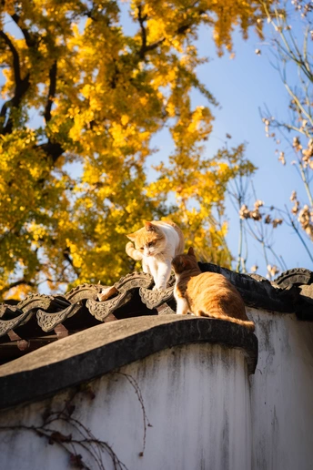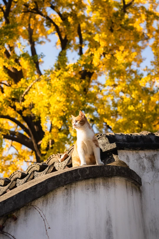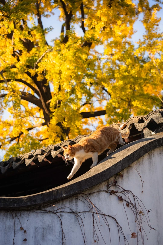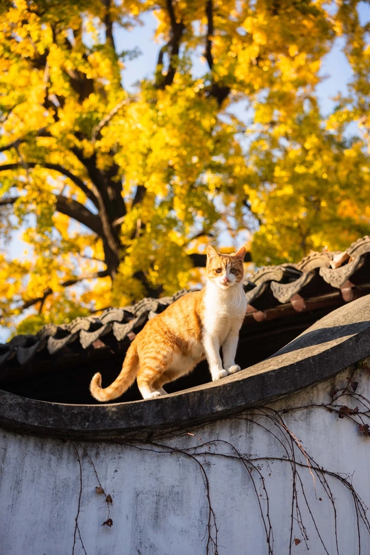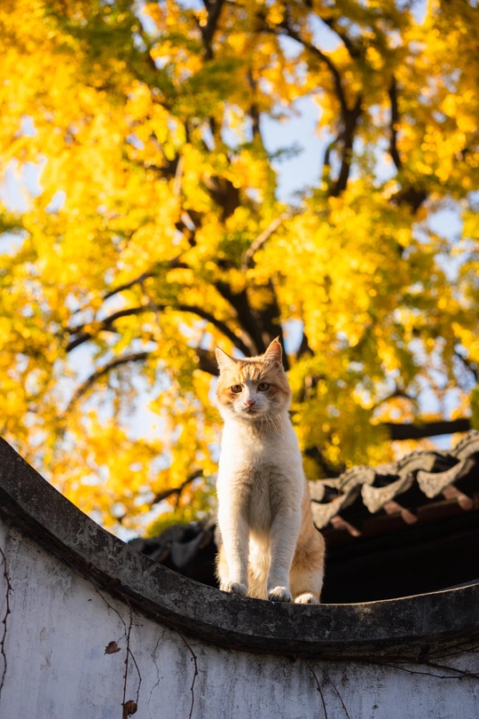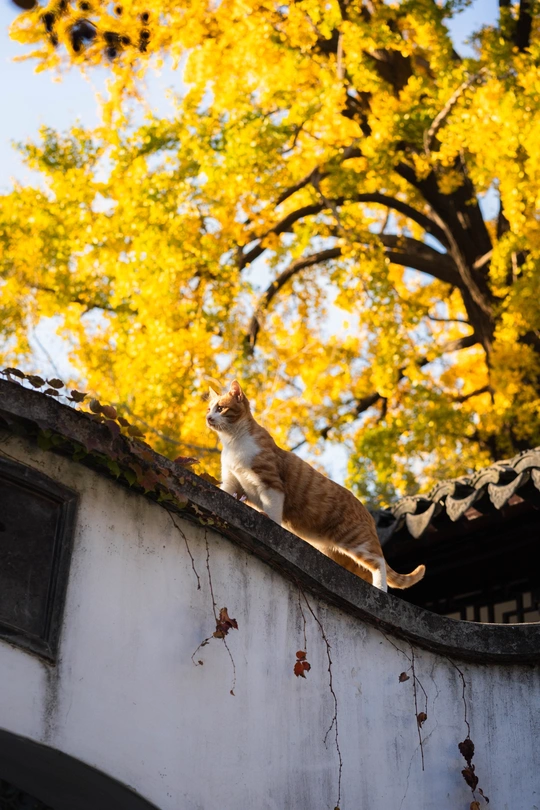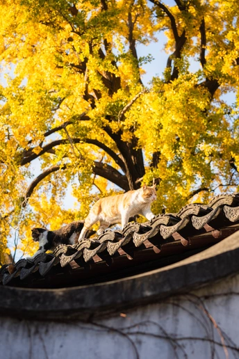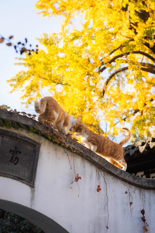 这个头碰头是有多用力呀。 园林里的这颗四百年的银杏总是每年最后黄透的,等它都落了苏州的秋天就正式结束了。而园林里的小猫喜欢在这颗银杏下的屋顶溜达巡视。尤其从高处俯瞰人的仰望不知道会是什么感觉。