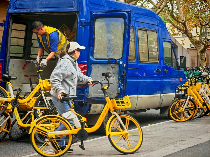 整体画面以黄、蓝为主色调,捕捉了城市共享单车日常调度的瞬间,展现出城市运维背后的平凡忙碌与街头的鲜活动态。
