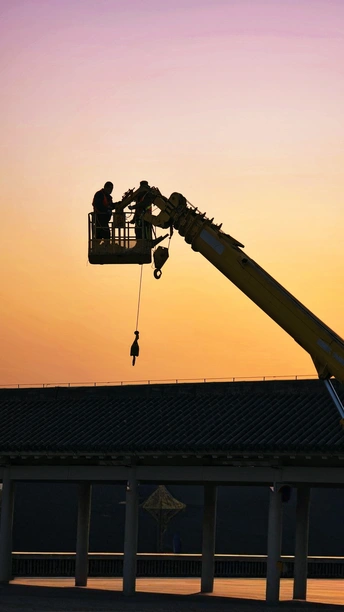初冬的下午,夕阳西下,在曲阜大成桥的廊桥上方,建筑工人正站在塔吊的栅格内,对桥上的灯光进行维修。这是塔吊升起的一瞬间,非常美的劳动画面。