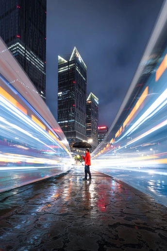 南京雨夜,我举伞步入其中,在两小时的等待后,我拍到了两辆有轨电车的交汇,使用长曝光拍摄,有轨电车形成了充满科幻感的光轨,放佛时空穿梭一般 拍摄于南京建邺区,雨中的摩天大楼充满了科幻感,长曝光下的流云也呈现出拉丝的质感 Shot on Sony a7m4、Sigma1424mm