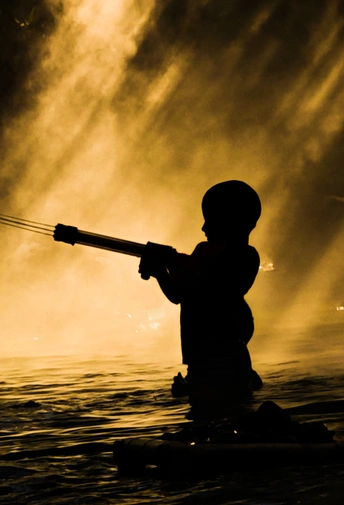 晨雾中,丁达尔光束如金纱垂落水面。孩童赤脚立于浅滩,水枪喷出的水珠在光柱中化作碎钻,与光线共舞。波纹荡开,光晕在水面晕染成流动的星河。他仰头笑望,光影在稚嫩脸庞跳跃,童真与自然奇景在此刻悄然相融,定格成永恒的魔法瞬间。