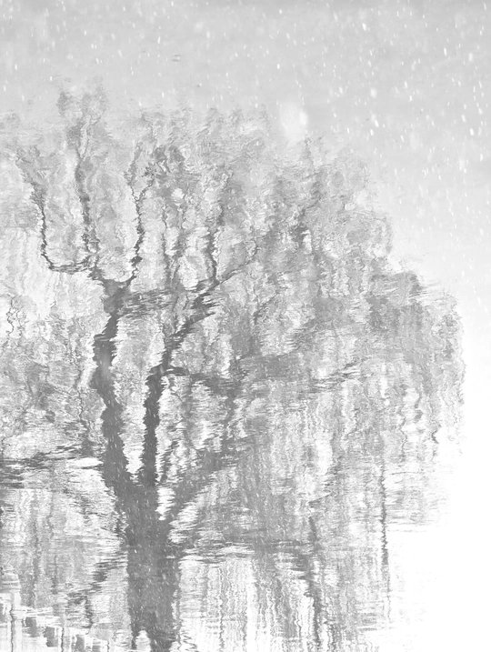 l雪天的树影倒映在还没有完全结冰的水面。