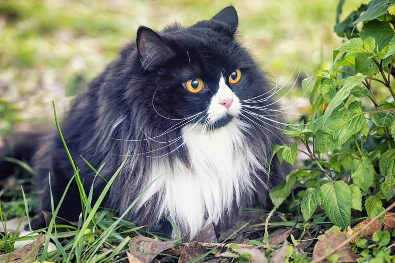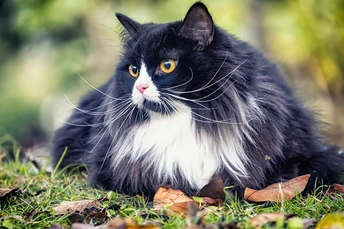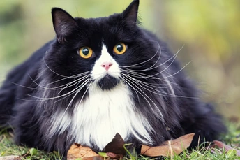 构图以经典三分法构建平衡:主体猫咪占据画面中央,蓬松毛发向四周自然舒展,形成稳定的三角形轮廓。摄影师采用低角度仰拍,将焦点锁定面部——雪白胡须如琴弦般向两侧延伸,与胸前V形白毛构成放射状视觉引导,引导观者视线最终落于那双琥珀色眼眸,达成“局部特写—整体氛围”的完美过渡。 色彩系统呈现极简美学:纯黑毛发如泼墨般覆盖全身,仅在鼻梁、下颌与胸前保留三簇雪色,形成“墨底留白”的东方意境。鼻尖的粉红与虹膜的金棕是点睛之笔,在绿色背景的映衬下,冷暖色调碰撞出微妙张力。落叶的赭石色散落草丛,为画面注入秋日温度,却不抢夺主体光彩。 情感表达藏于细节褶皱:猫咪微侧的头颅、前伸的胡须、半眯的瞳孔,共同塑造出“警觉中带着慵懒”的复杂情绪。蓬松毛发根根分明,既显高贵矜持,又透着野生的桀骜;而爪边蜷曲的枯叶,则暗示着这份优雅背后,藏着对自然的全然信赖。 主题直指“生命本真的凝视”:当镜头剥离所有叙事背景,仅保留猫与自然的对视,反而凸显出一种哲学意味——那双不掺杂质的金瞳,既是对世界的好奇打量,也是对人类的无声叩问:在被规训的文明之外,何为自由的姿态? 艺术价值在于“日常神性的捕捉”:摄影师未刻意美化或拟人化。